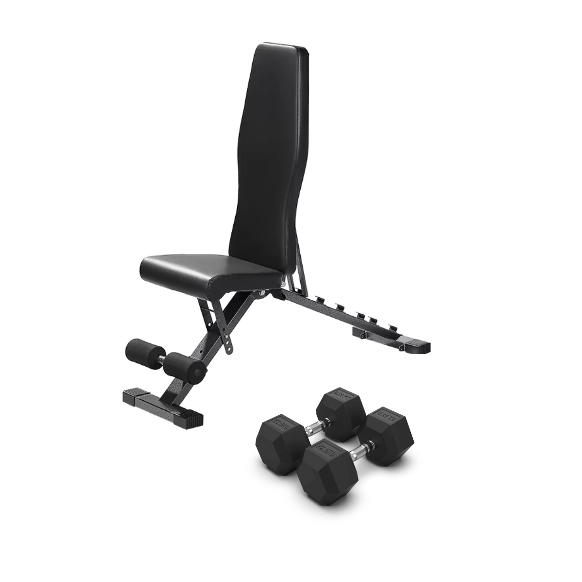 22.5kg Adjustable Dumbbell Bench Bundle is the perfect strength workout solution for Home Gyms. The Bench has multiple positions on the backrest and seat, and also leg adjustment possibilities. Additionally, the reinforced steel structure offers maximum stability and safety. Solid in construction and compact in size, enjoy the benefits of having this fitness machine at home. This Bundle includes a set of 22.5kg hex Dumbbells.