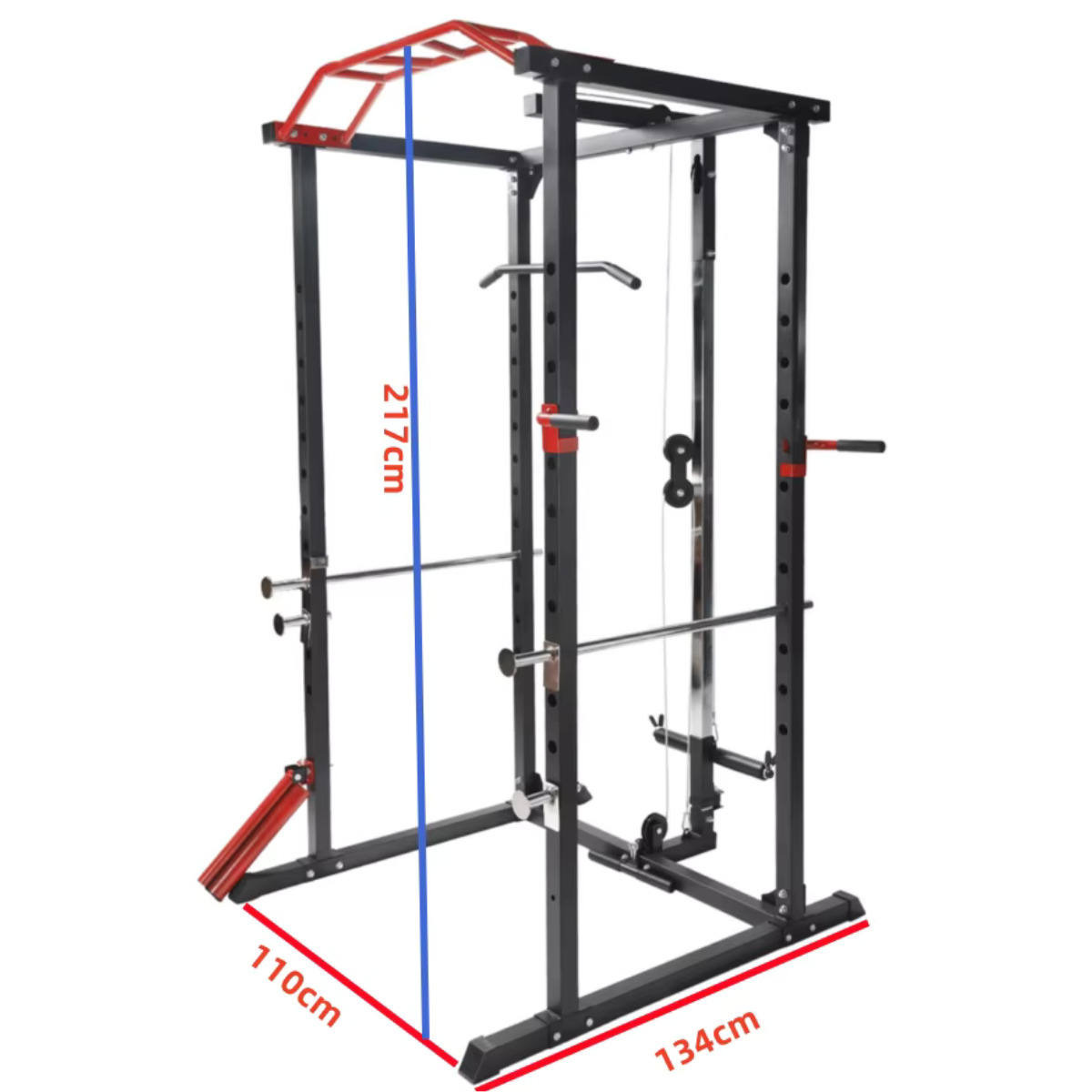 The Premier Strength Home Power Rack with Lat Pull Down and Low Row is designed for homes and garage gyms. Designed using box steel with hardened chrome attachments that include a landmine attachment, Multi-grip pull-up bar, and jcup holders for Olympic barbells.